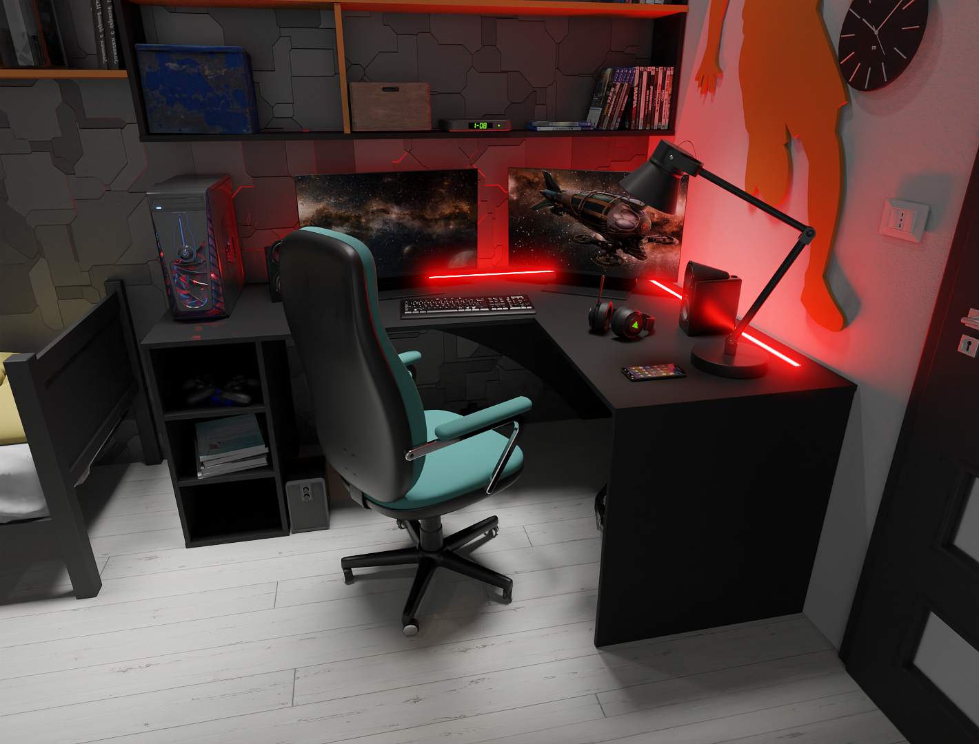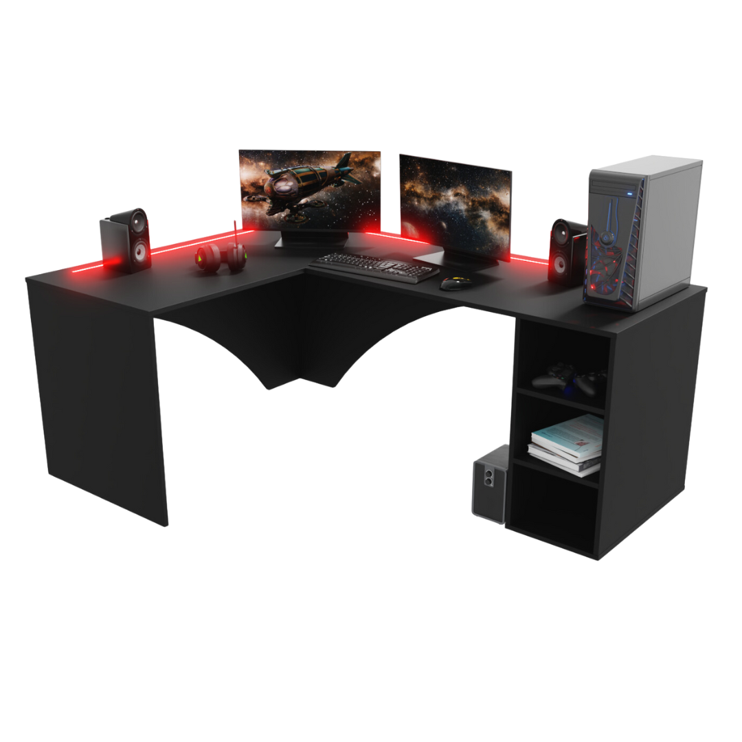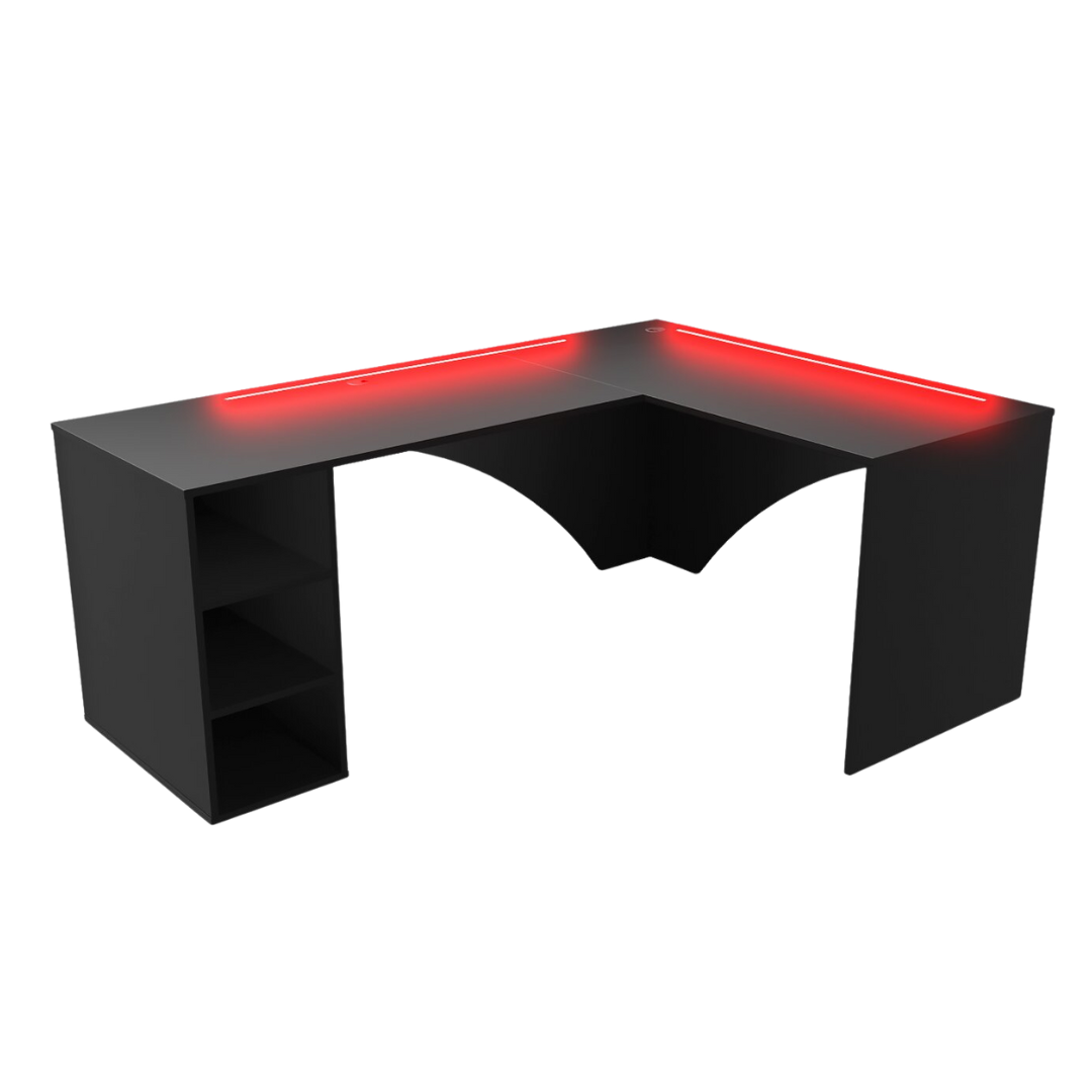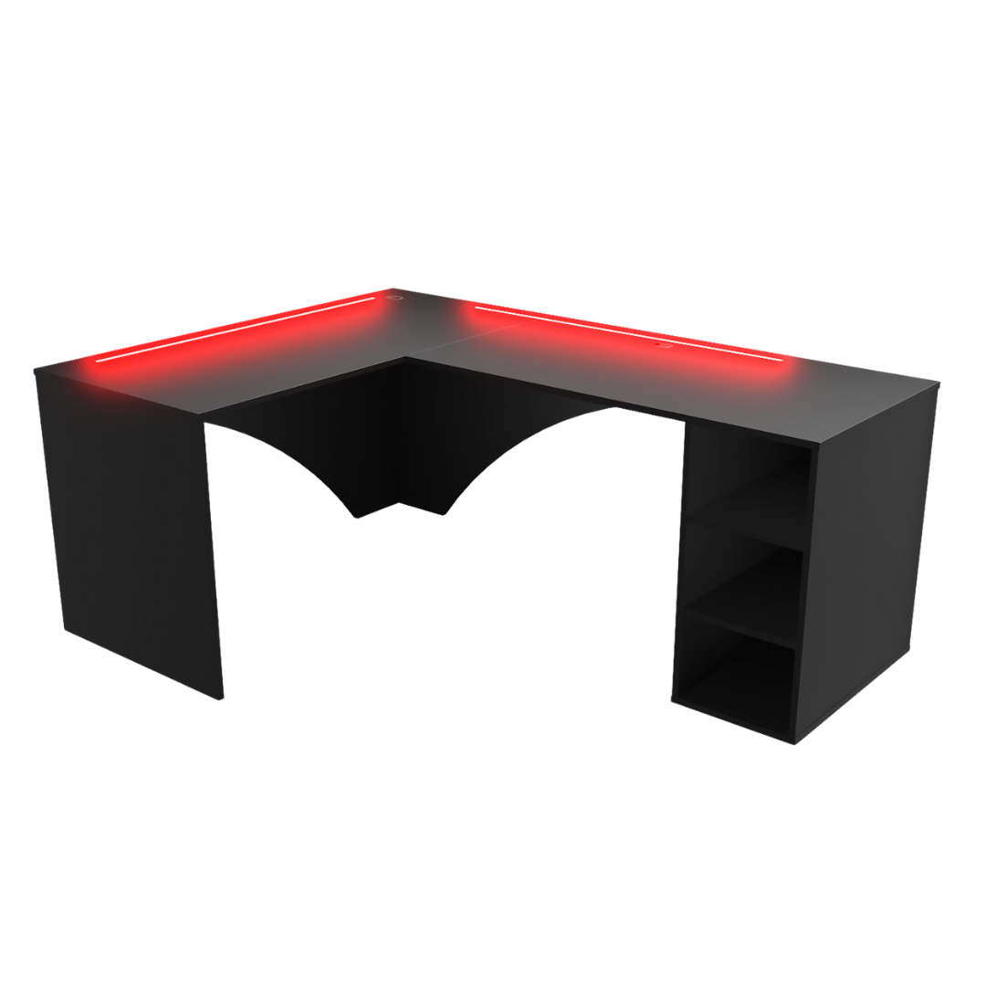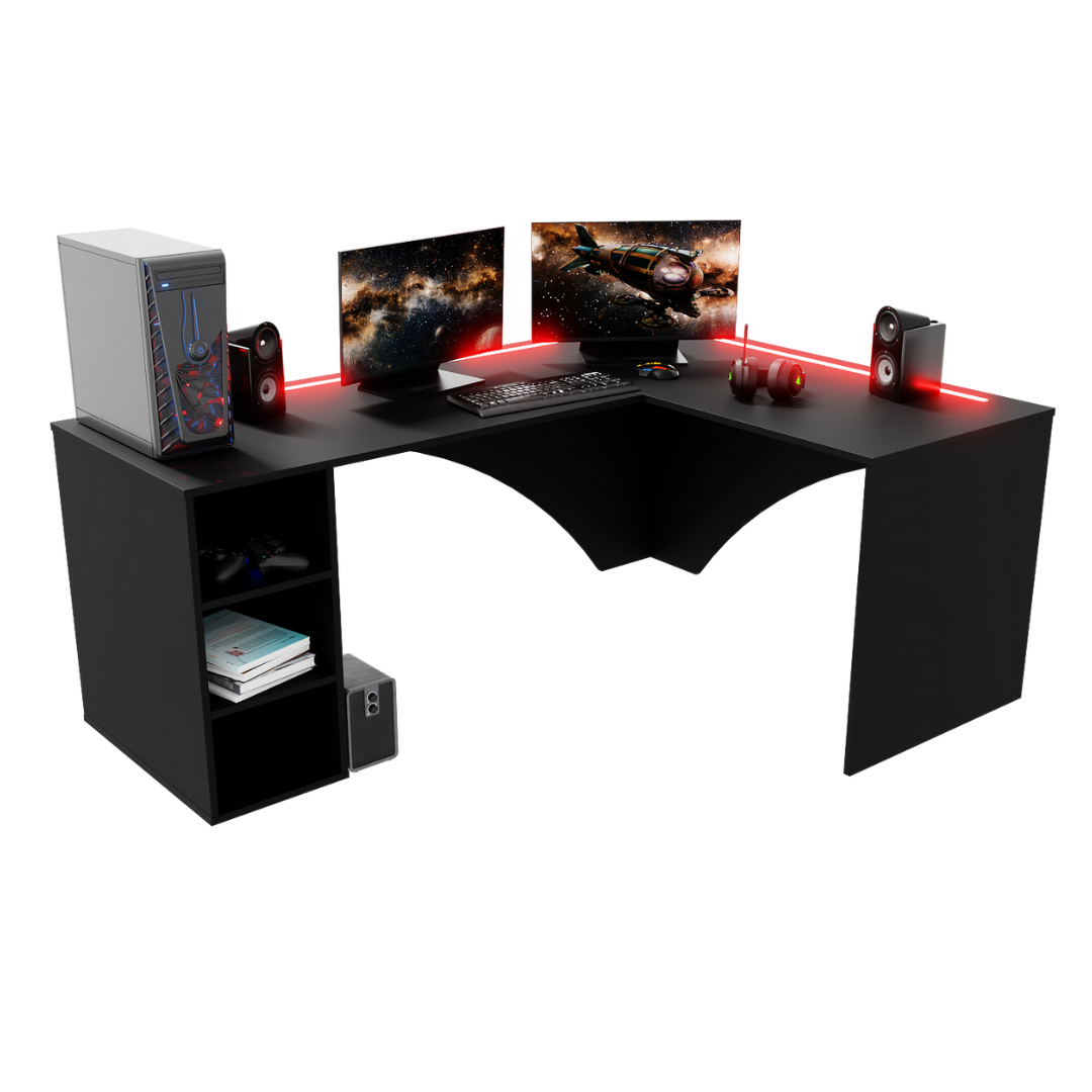 Biurko gamingowe narożne z listwą LED w aluminiowych profilach tworzy unikalny klimat. Dzięki pilotowi możesz wybrać jeden z 16 kolorów oraz ustawić odpowiedni tryb świecenia. Idealne rozwiązanie do nowoczesnych wnętrz – sprawdzi się jako biurko komputerowe, biurko narożne lub biurko ergonomiczne do pracy, nauki i gamingu.