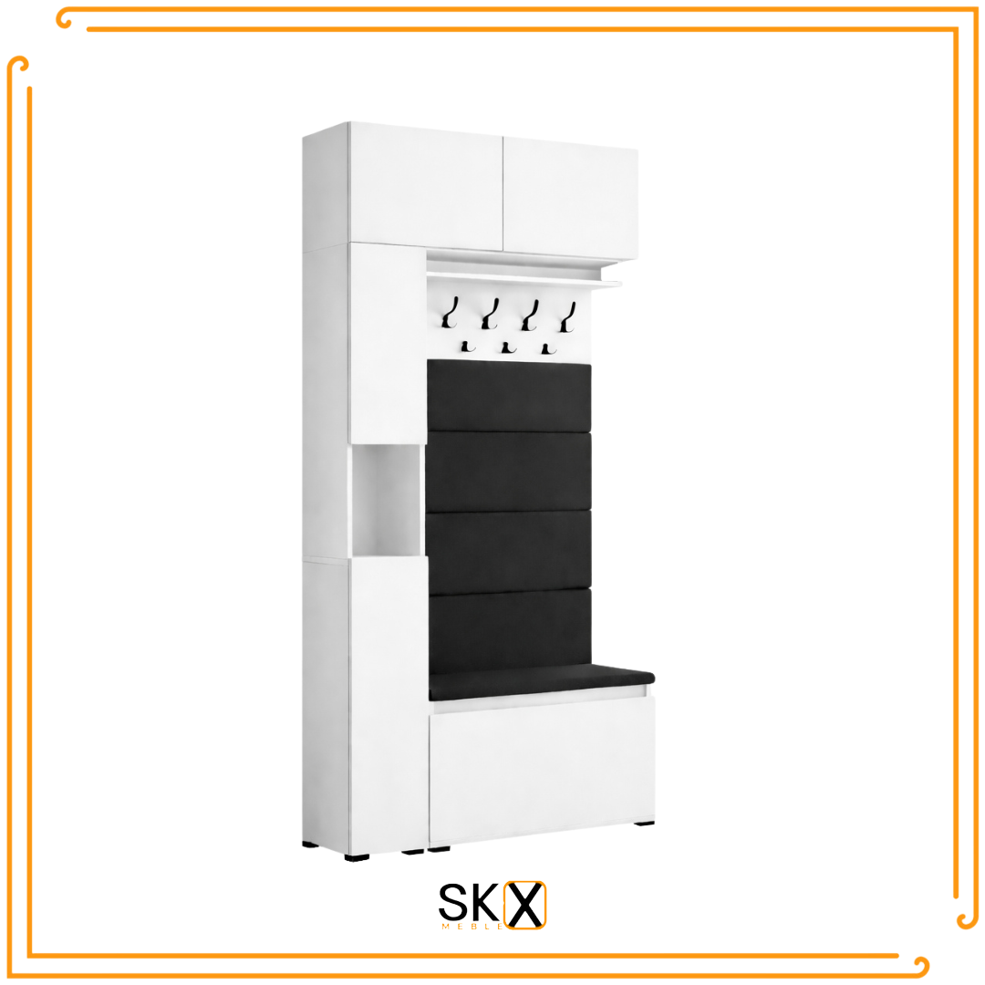 Zestaw garderoba to idealne rozwiązanie do przedpokoju. Dzięki przemyślanemu projektowi garderoba łączy nowoczesny wygląd z funkcjonalnością. Szafka na buty umożliwia przechowywanie obuwia, wieszak na ubrania pozwala uporządkować odzież wierzchnią, a tapicerowane siedzisko i panele dodają wygody i stylu.