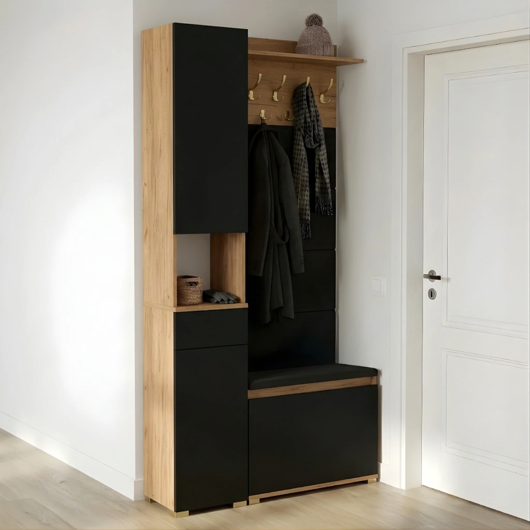 Kompletny zestaw meblowy Lova + Sora2 + Nova to idealne rozwiązanie do przedpokoju na buty połączające wieszak, panele tapicerowane i wygodne siedzisko. Całość w stylowym kolorze Złoty Craft tworzy spójną, nowoczesną garderobę, która zmieści wszystkie niezbędne rzeczy. Solidna konstrukcja, funkcjonalna szuflada i przemyślany design sprawiają, że to najlepszy wybór do każdego domu.