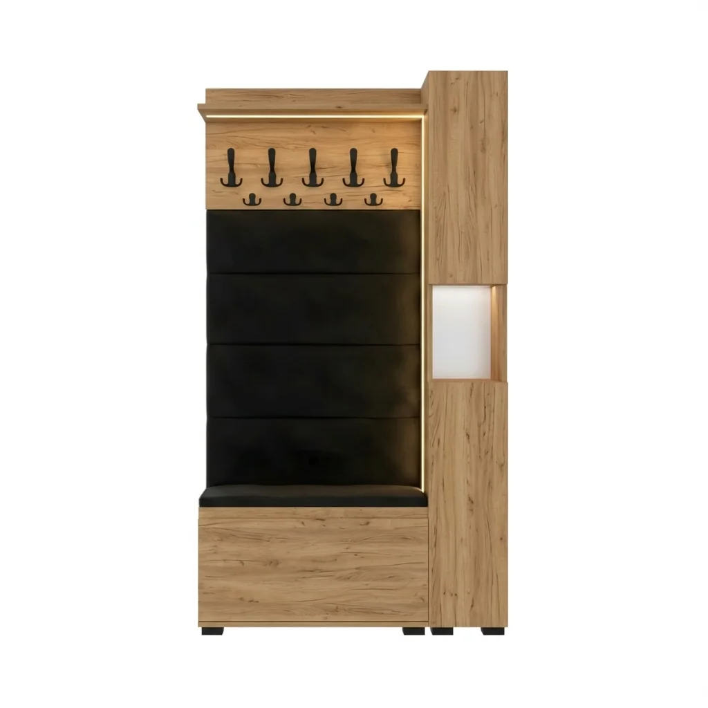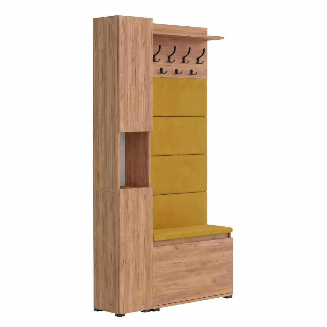 ✅ Panele tapicerowane – Zestaw zawiera 4 panele tapicerowane na górze, które tworzą elegancką kompozycję z wieszakiem wyposażonym w praktyczne haczyki. Panele w kolorze Złoty Craft doskonale się komponują, nadając przedpokojowi nowoczesny wygląd.