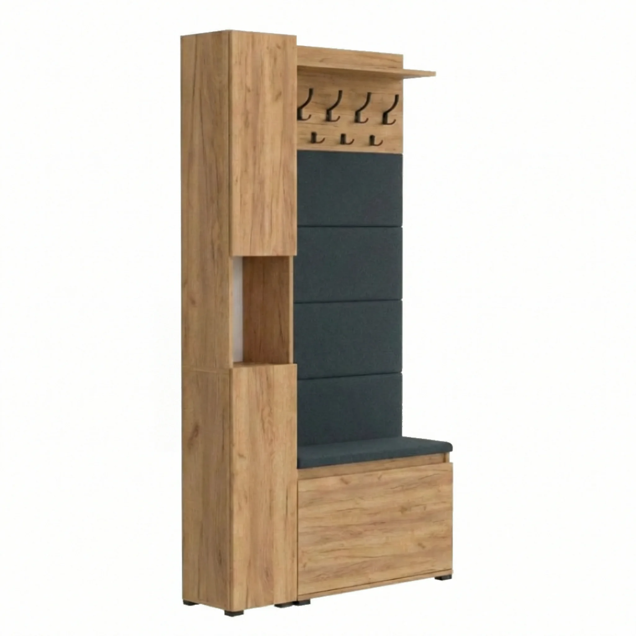 Kompleksowe rozwiązanie do przedpokoju, które łączy stylowe panele tapicerowane z praktyczną szafką na buty z siedziskiem. Ten zestaw garderobiany oferuje nie tylko przechowywanie obuwia, ale także wygodne siedzisko, wieszak na ubrania i elegancki słupek w kolorze Złoty Craft. Dzięki możliwości montażu w różnych konfiguracjach, meble idealnie dopasują się do Twojej przestrzeni, tworząc funkcjonalny i estetyczny przedpokój.