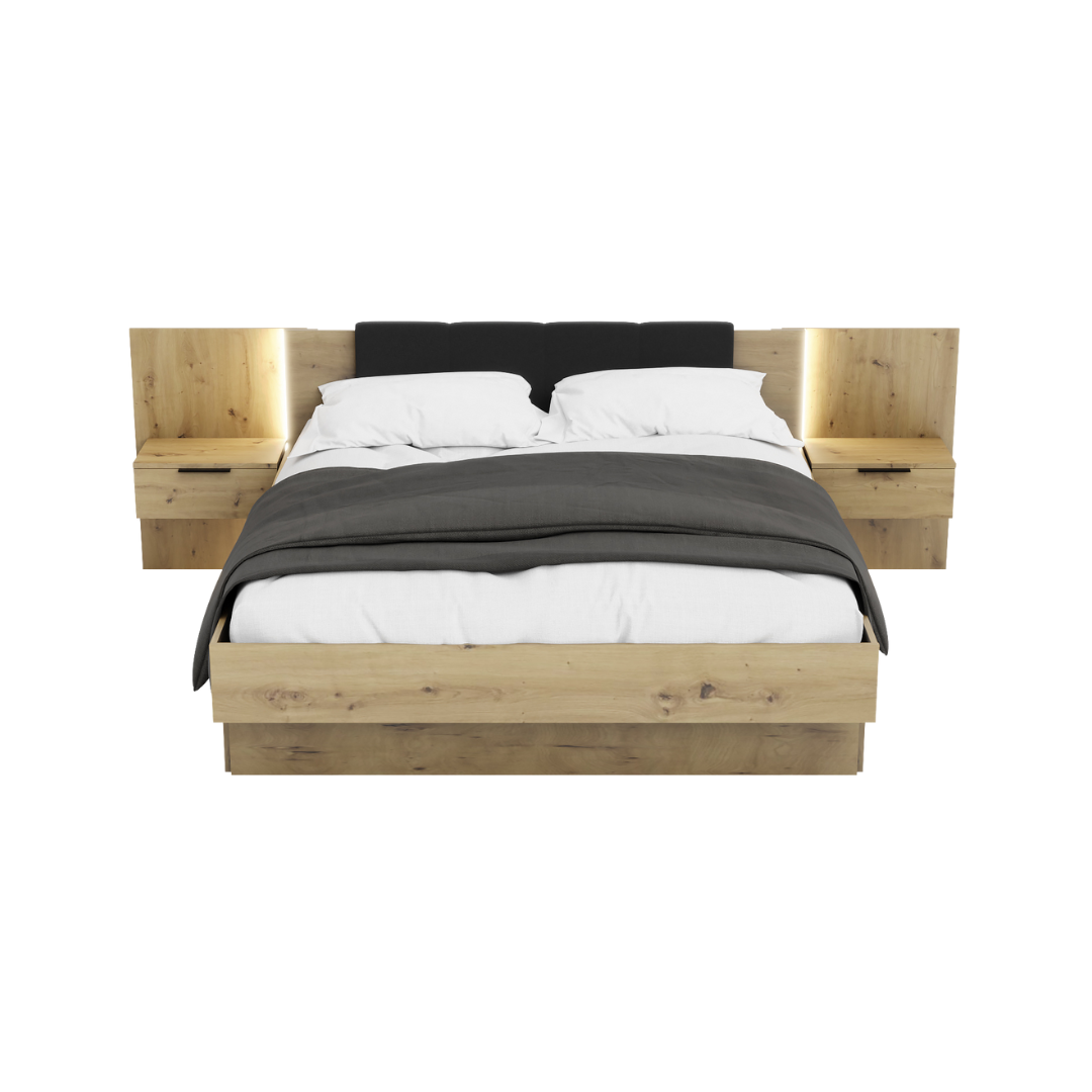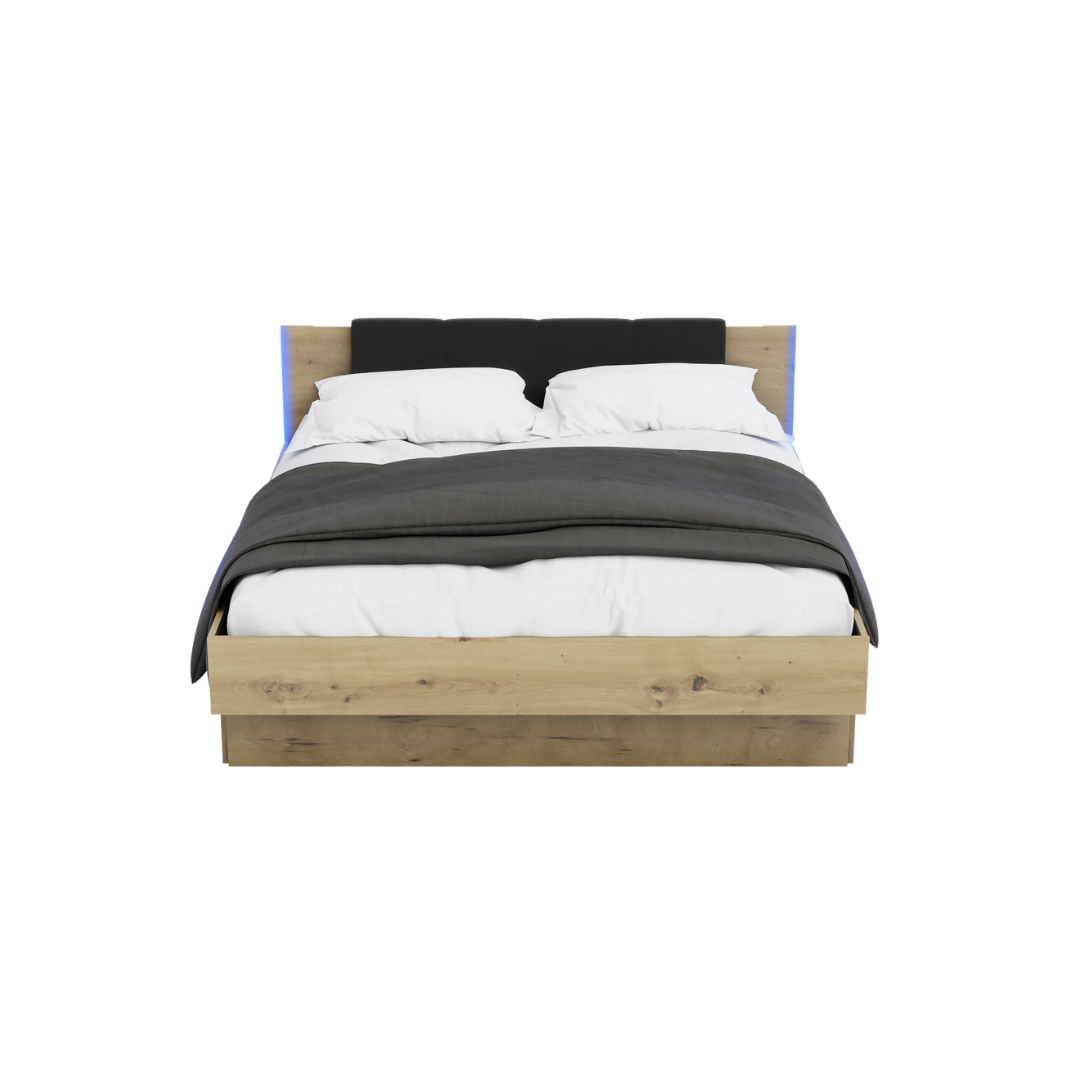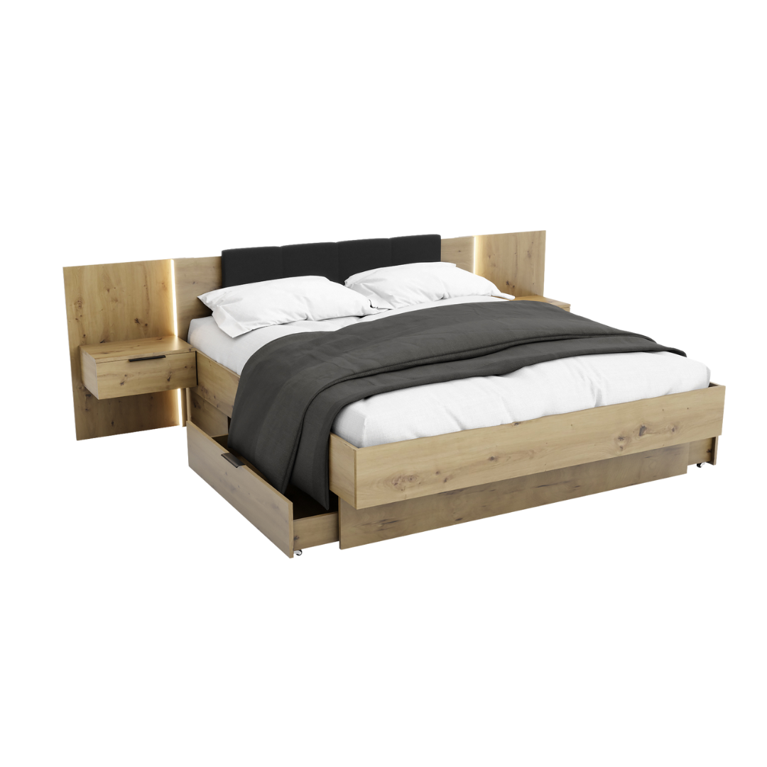Łóżko sypialniane Arkadia wyróżnia się dużą powierzchnią do spania, stabilną konstrukcją oraz trwałą płytą 1.8 cm, znacznie wytrzymalszą niż standardowe rozwiązania. Dwie pojemne szuflady umożliwiają wygodne przechowywanie pościeli lub akcesoriów, a tapicerowany zagłówek podnosi komfort codziennego użytkowania. Oświetlenie LED nadaje meblowi elegancki i nowoczesny wygląd, dzięki czemu nowoczesne łóżko do sypialni idealnie wpasuje się w każde stylowe wnętrze. Dedykowany stelaż w zestawie!