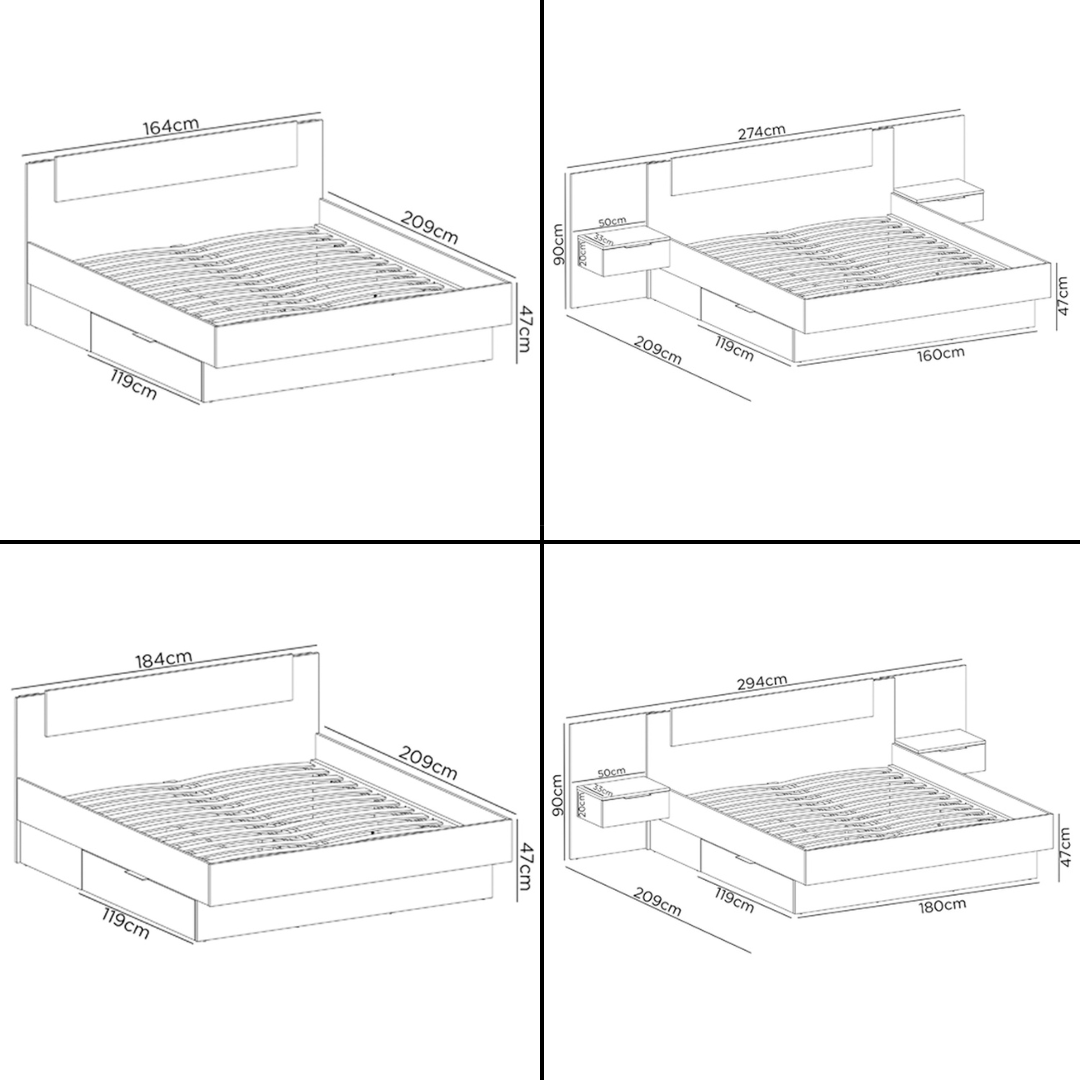 ✅ Dwie wiszące szuflady boczne – Dodatkowe szuflady zawieszone po bokach łóżka sypialnianego zapewniają wygodne miejsce na przechowywanie drobiazgów, takich jak książki, telefon czy akcesoria – zawsze w zasięgu ręki.