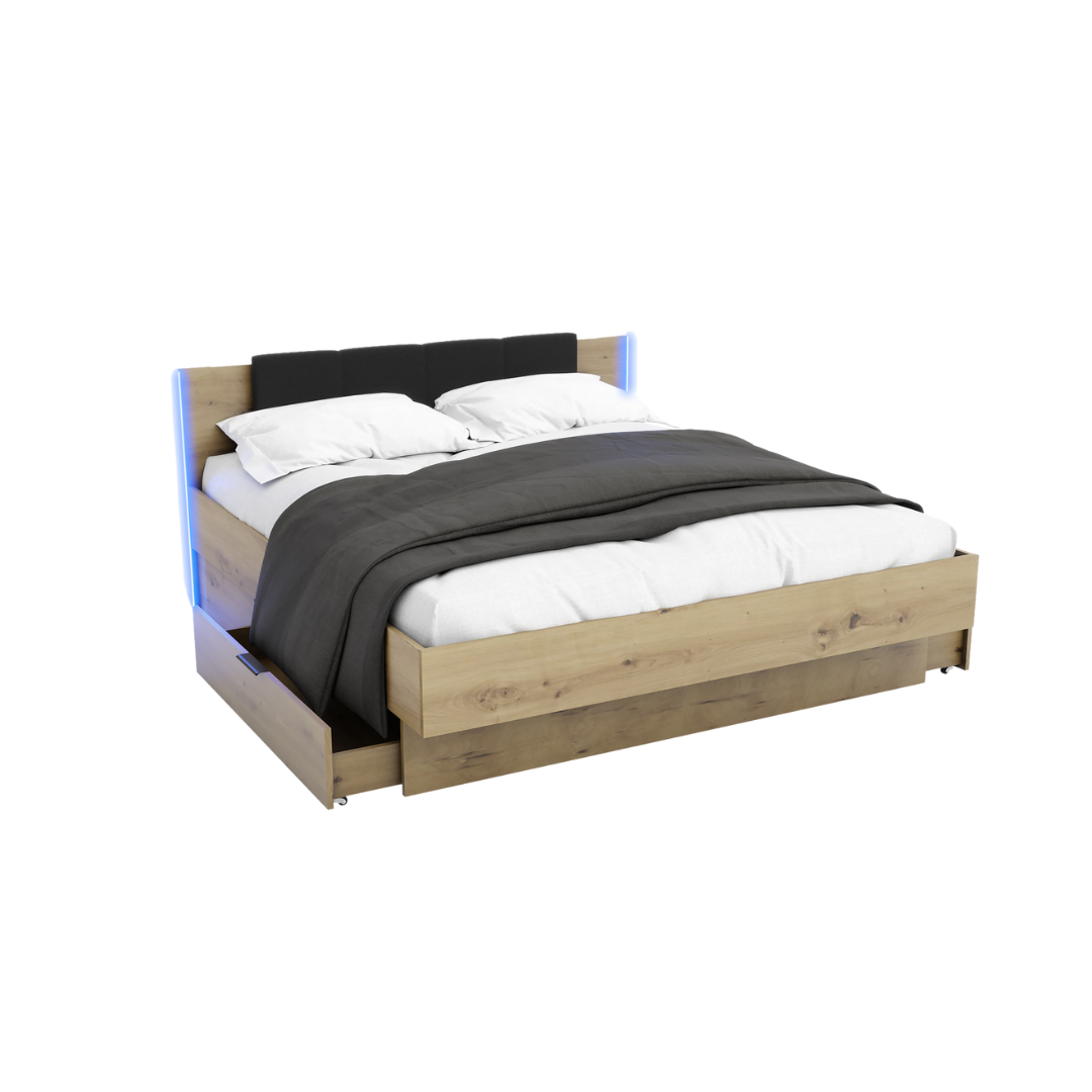 Łóżko sypialniane Arkadia zachwyca przestronnym miejscem do spania, mocną konstrukcją i trwałą płytą 1.8 cm. Tapicerowany zagłówek i LED-owe podświetlenie wprowadzają nowoczesny klimat, a pojemne szuflady sprawdzą się przy przechowywaniu. Idealny wybór dla fanów nowoczesnych łóżek do sypialni. Zestaw zawiera dedykowany stelaż.