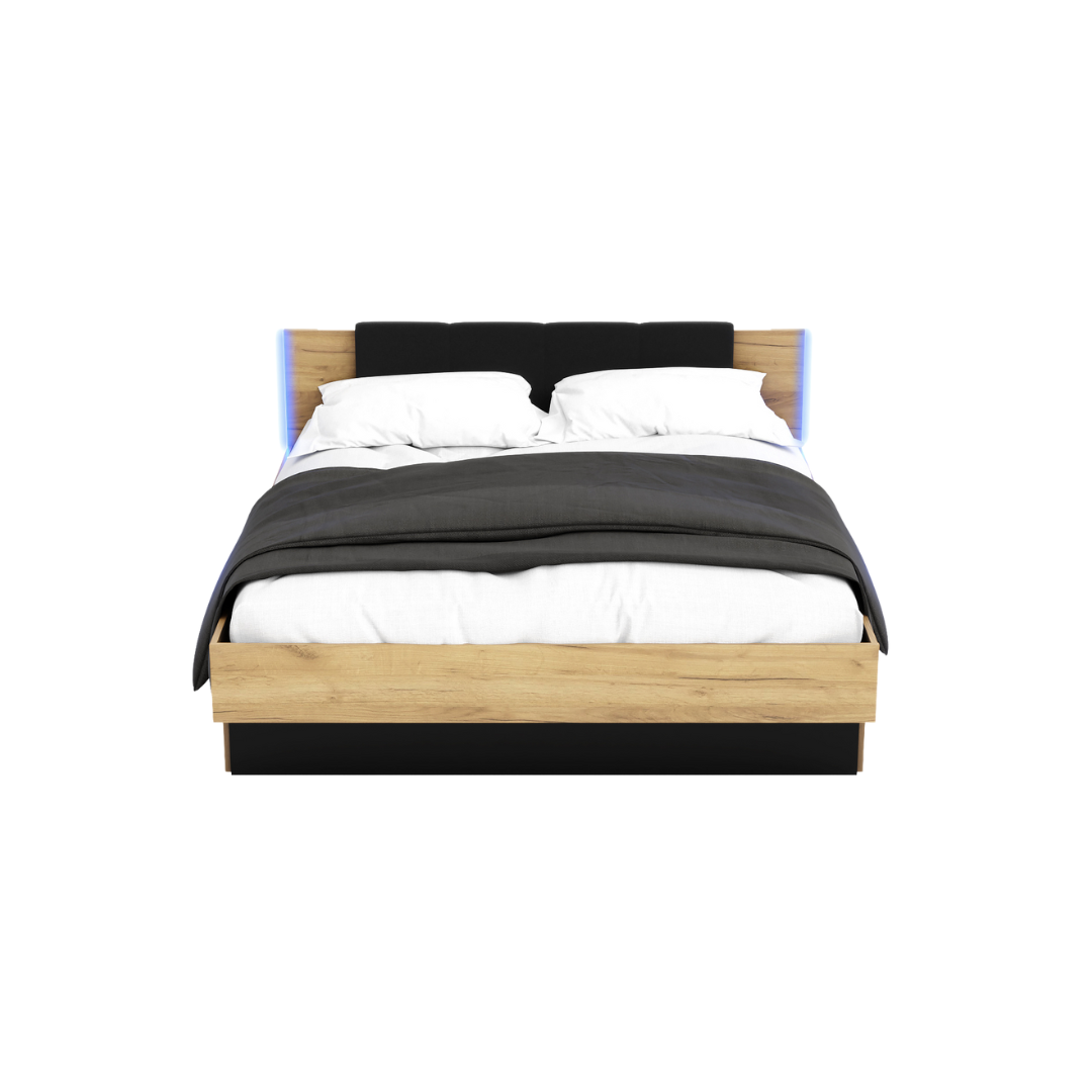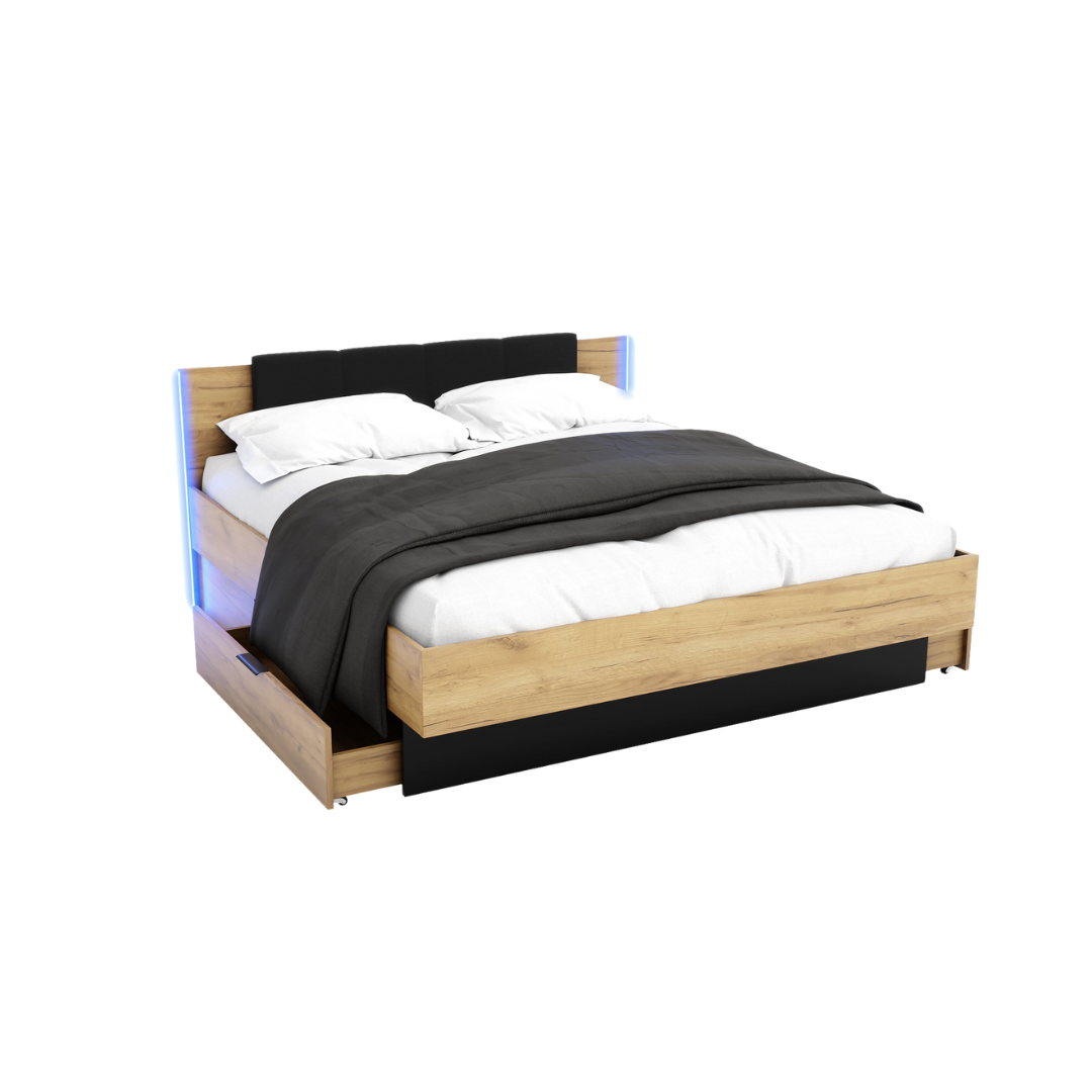 Łóżko sypialniane Arkadia wyróżnia się dużą powierzchnią do spania, stabilną konstrukcją oraz trwałą płytą 1.8 cm, znacznie wytrzymalszą niż standardowe rozwiązania. Dwie pojemne szuflady umożliwiają wygodne przechowywanie pościeli lub akcesoriów, a tapicerowany zagłówek podnosi komfort codziennego użytkowania. Oświetlenie LED nadaje meblowi elegancki i nowoczesny wygląd, dzięki czemu nowoczesne łóżko do sypialni idealnie wpasuje się w każde stylowe wnętrze. Dedykowany stelaż w zestawie!
