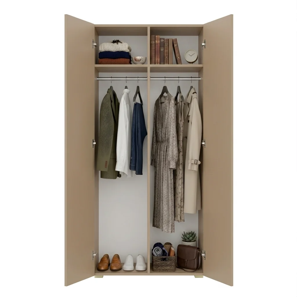 ➡️ Szafa posiada dwa boki oraz dodatkową płytę środkową, która dzieli wnętrze na dwie części i zwiększa stabilność konstrukcji.