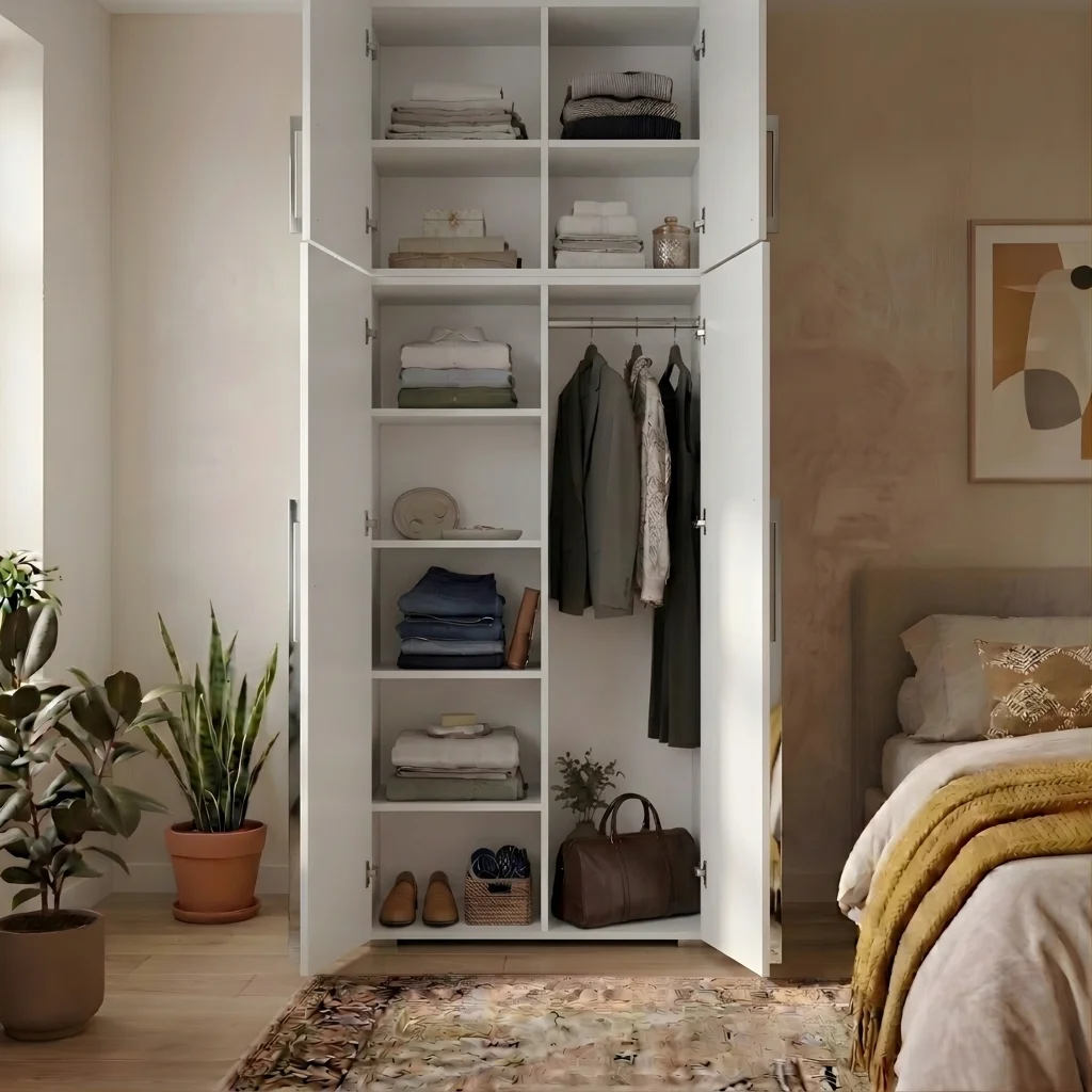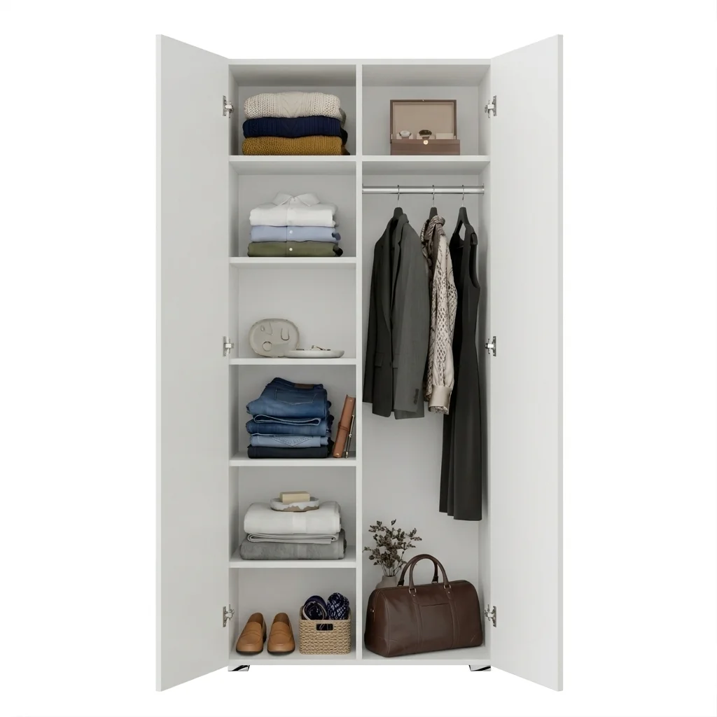 ✅ Regulacja półek – Wnętrze szafy wyposażone jest w nawierty rozmieszczone co 6,4 cm, umożliwiające swobodne ustawianie półek na dowolnej wysokości i łatwe dopasowanie przestrzeni do przedmiotów o różnych rozmiarach.