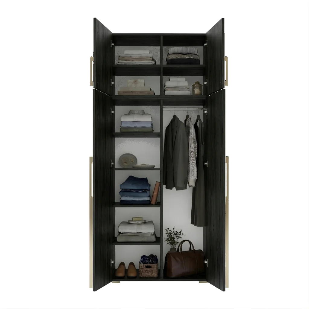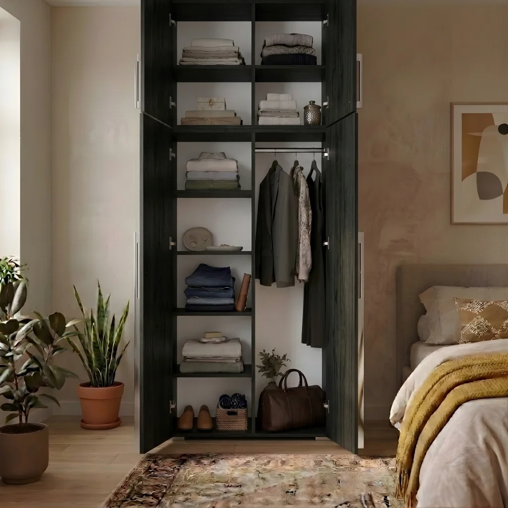 Szafa Kama Podwójna Nadstawka wyróżnia się dopasowaniem z dokładnością do 1 cm, co czyni ją doskonałym wyborem zarówno jako szafa do przedpokoju, jak i szafa do sypialni. Regulowane półki, elastyczny montaż drążka oraz możliwość rozbudowy o nadstawkę sprawiają, że wnętrze szafy można dostosować dokładnie do własnych potrzeb i przechowywanej garderoby. Solidna konstrukcja i przemyślany system organizacji przestrzeni gwarantują funkcjonalność i trwałość w codziennym użytkowaniu. Dostępna w kolorze Czarny Onyx, szafa podwójna Kama Podwójna Nadstawka harmonijnie wpisuje się w różne style aranżacji wnętrz.