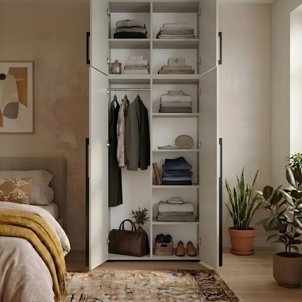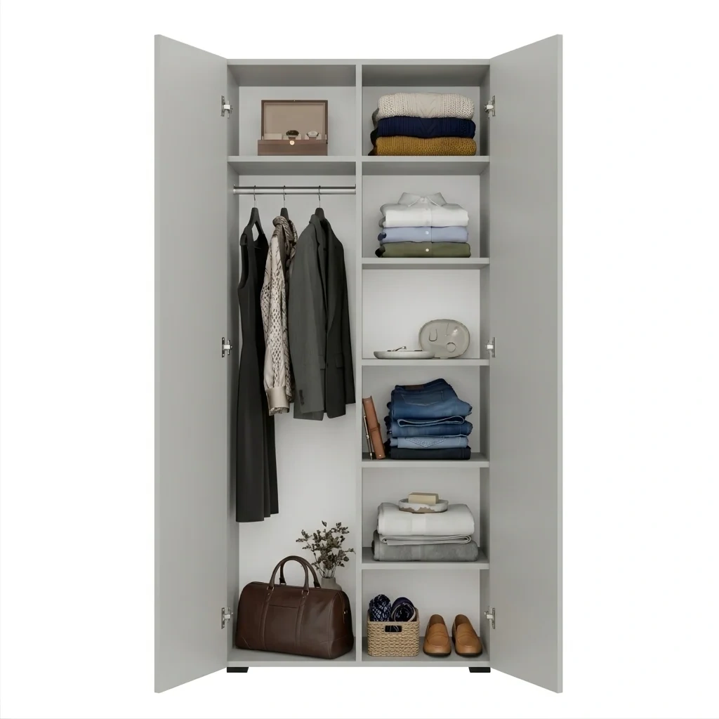 ✅ Regulacja półek – Wnętrze szafy wyposażone jest w nawierty rozmieszczone co 6,4 cm, umożliwiające swobodne ustawianie półek na dowolnej wysokości i łatwe dopasowanie przestrzeni do przedmiotów o różnych rozmiarach.