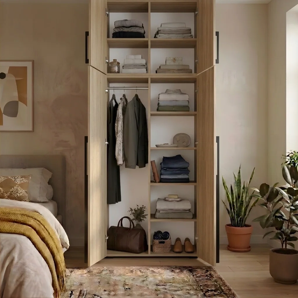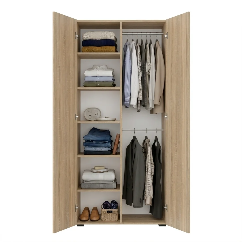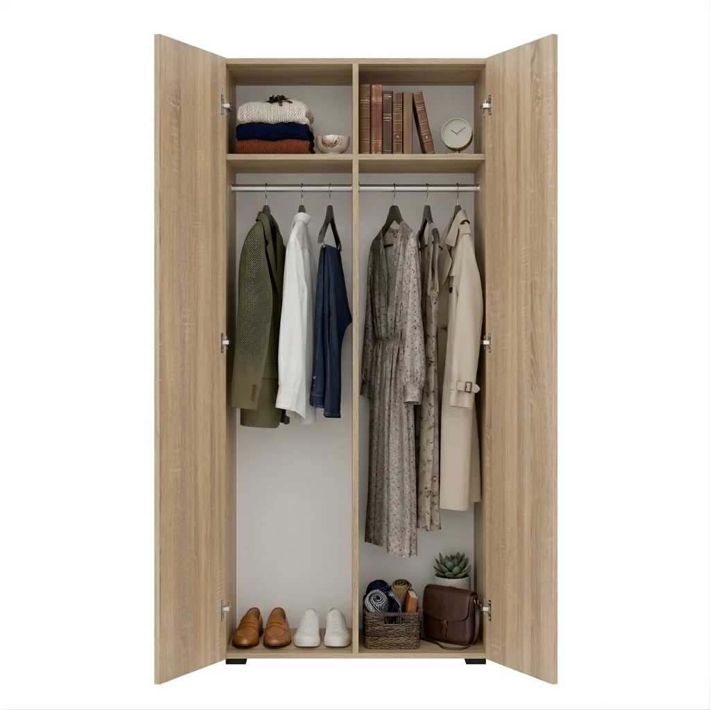 ➡️ Szafa posiada dwa boki oraz dodatkową płytę środkową, która dzieli wnętrze na dwie części i zwiększa stabilność konstrukcji.