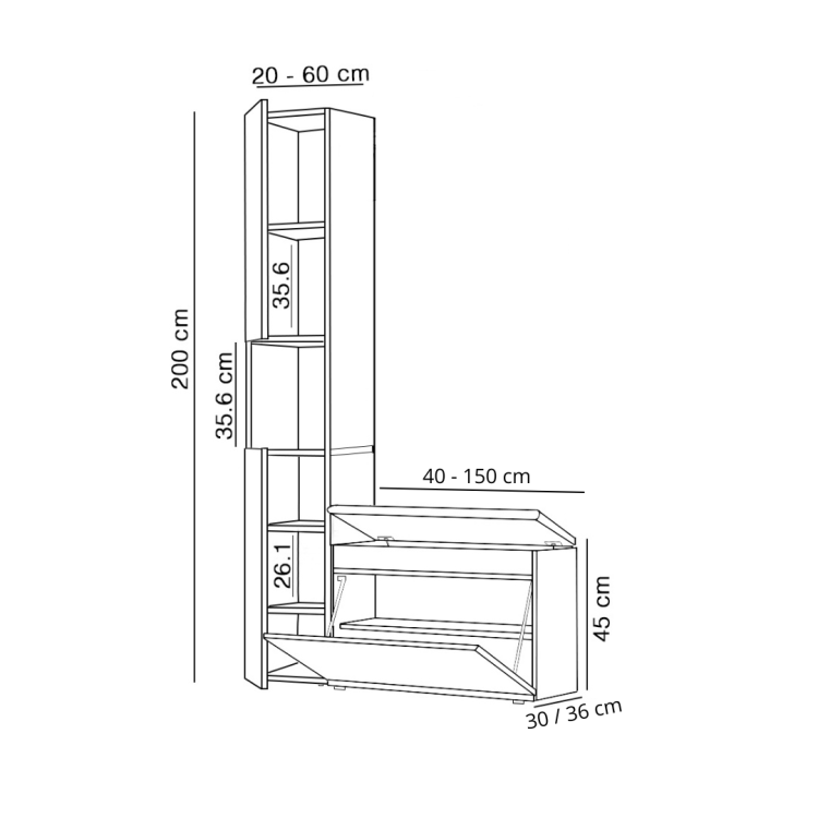 ✅ Słupek wąski z półkami – Pojemna szafka do przedpokoju Nova + Sora to słupek do przedpokoju o eleganckim, zwężonym profilu, który nie zajmuje dużo miejsca. Mimo kompaktowych wymiarów, konstrukcja zawiera wiele półek, oferując znaczną ilość przestrzeni do przechowywania obuwia, dodatków i innych przedmiotów codziennego użytku.
