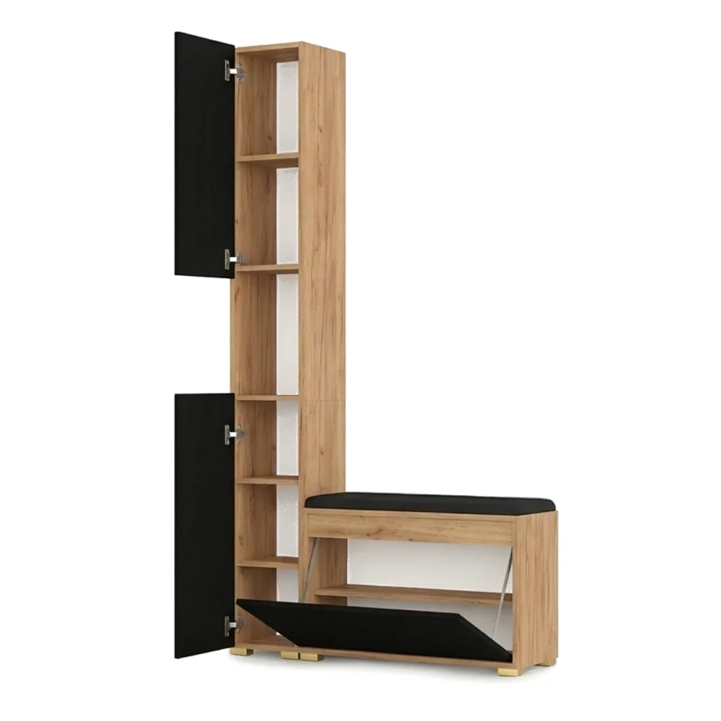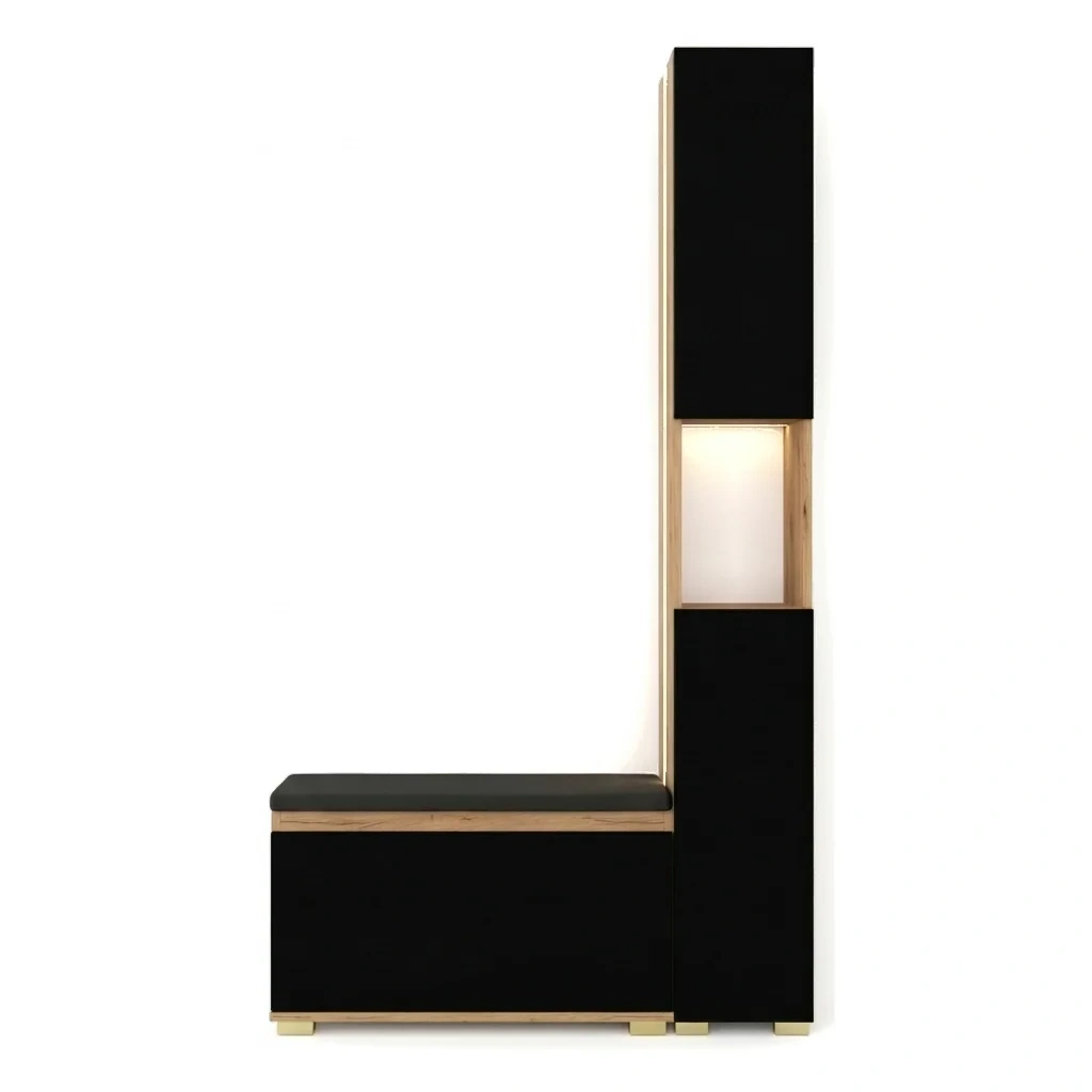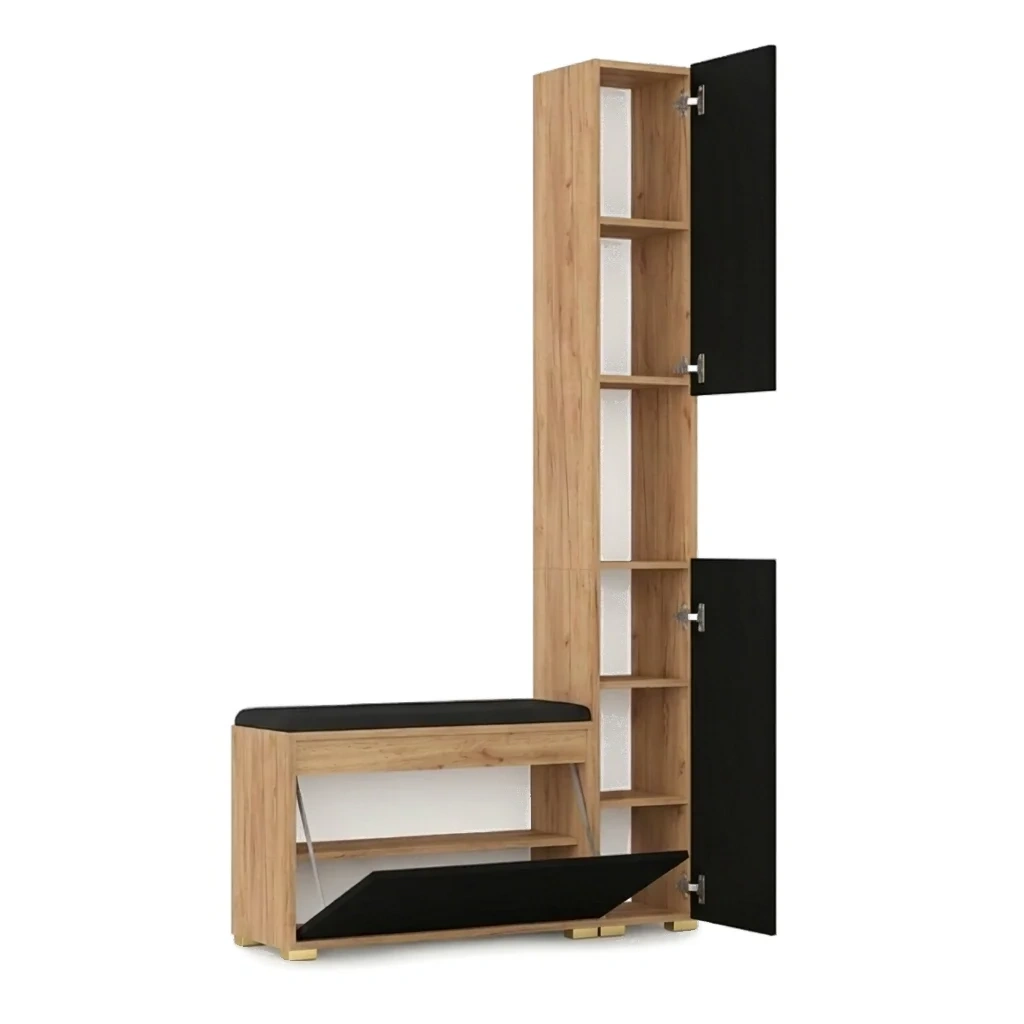 Szafka Do Przedpokoju Na Buty Pojemna z Siedziskiem Słupek Z Półkami Złoty Craft + Czarny Front Nova Sora