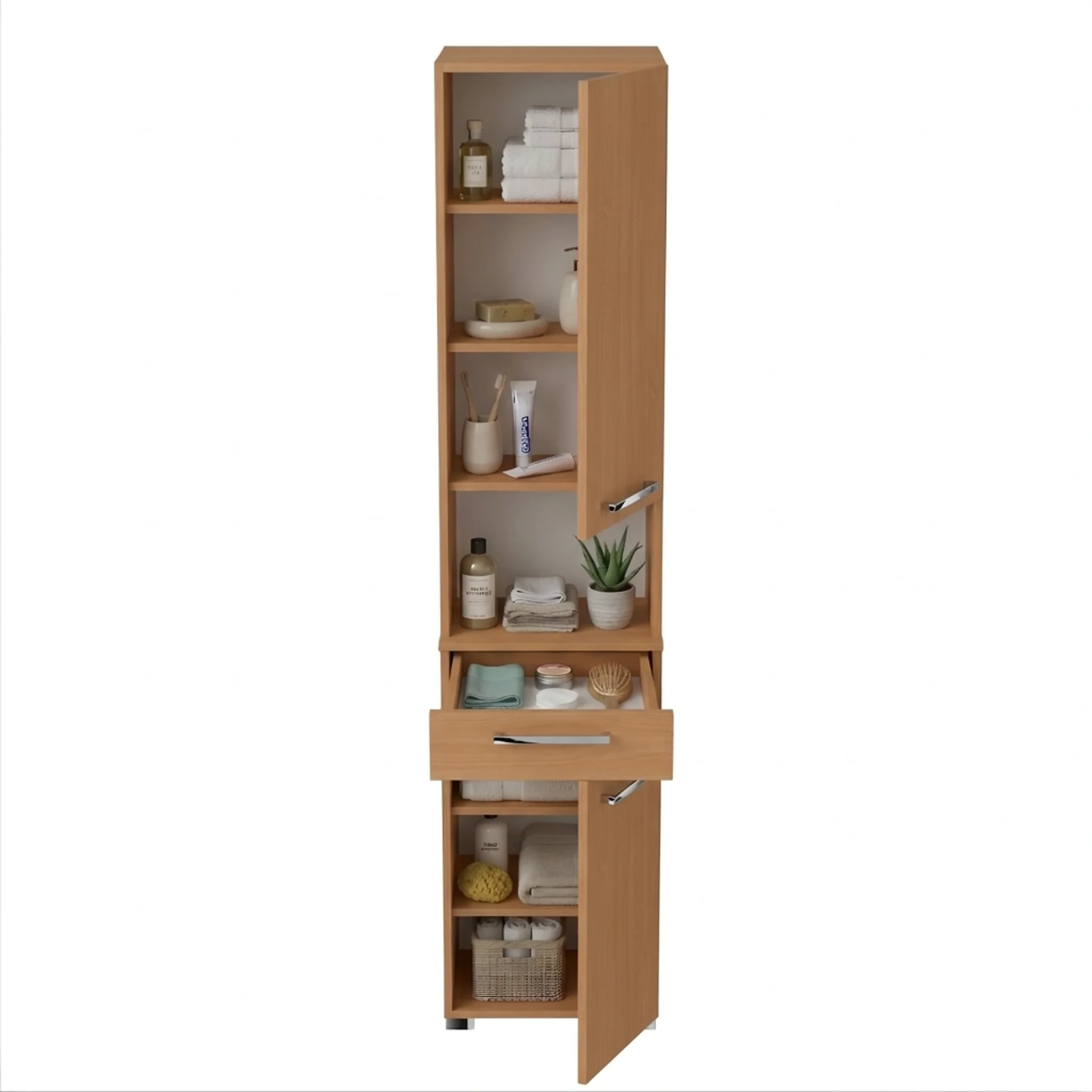 Szafka łaziankowa Lora to idealne rozwiązanie do małych i większych łazienek. Połączenie funkcjonalnej szuflady, pojemnych półek i uniwersalnego montażu obustronnego sprawia, że ten słupek do łazienki jest zarówno prakticzny, jak i elegancki. Wybierz słupek wąski Lora 2 w kolorze Buk i ciesz się doskonale zorganizowaną łazienką każdego dnia.