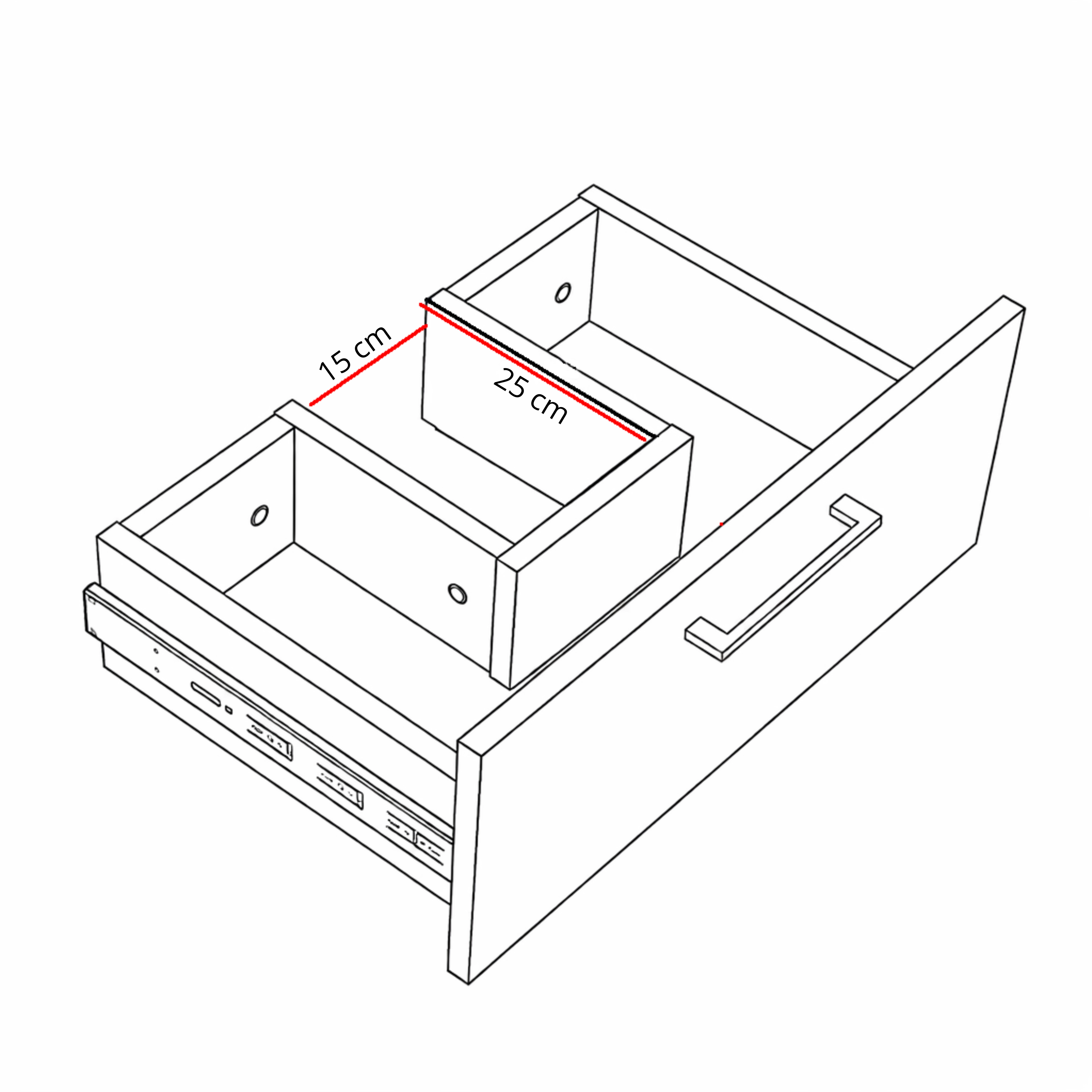 ➡️ Wymiary wycięcia na syfon w obu górnych szufladach to 15 cm szerokości x 25 cm głębokości